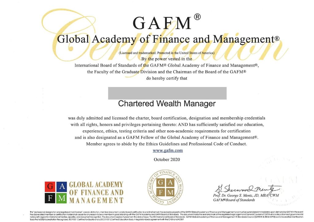 (AAFM™/GAFM™)美国四大金融认证机构:美国金融管理学会AAFM™/GAFM™、 特许金融分析师协会CFA、标准委员会CFP、美国学院ChFC。